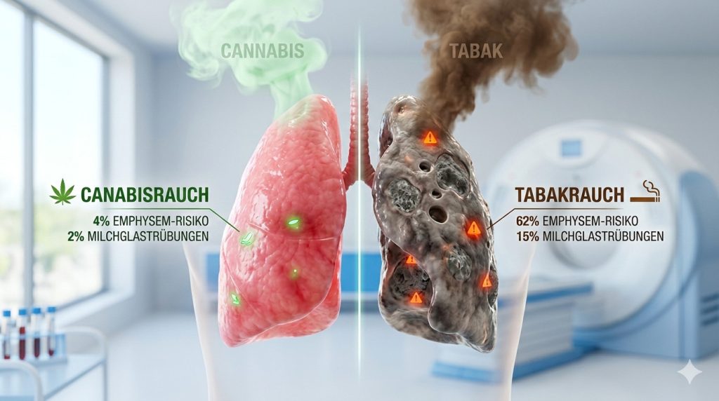유리질 음영(중심 소엽 유리질 침윤)의 발생에서도 유사하게 명확한 차이가 나타났습니다. 이는 비특이적인 (이름에서 알 수 있듯이) 유백색의 구조적 결손을 폐 조직에서 말합니다. 종종 염증 과정이 기초가 됩니다. 담배 흡연자의 15%가 영향을 받았던 반면, 대마초 사용자는 단 2%에 불과했습니다.